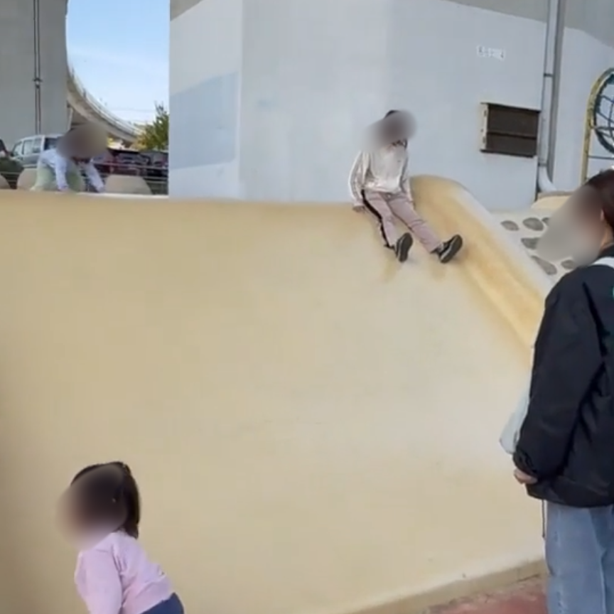 3歳の子どもは、高架下にある石のすべり台に少し怖がりつつもチャレンジ。